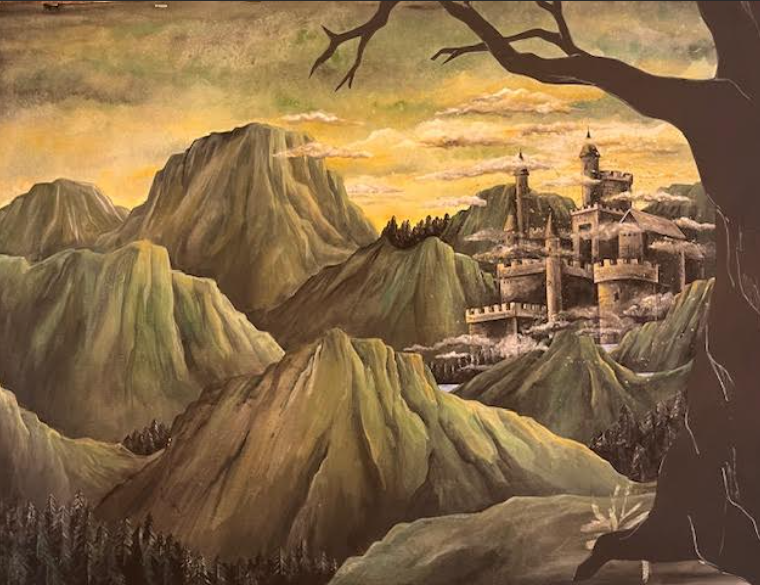 And here we have the final painting. Highlights in the tree have been punched out using Prismacolor colored pencils. I have added a few details to the mountains to give them depth and have added hints of forests nestled among the mountains. Remember, the spine of the book will be down the center of the painting and the painting will only be viewed through Kismarc's silhouette on the front cover. I'm excited to see how the finished cover turns out.